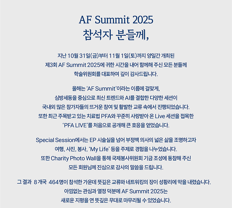 AF SUMMIT 2025 AF SUMMIT 2025 PROGRAM ABSTRACT / CASE REGISTRATION HOTEL SPONSORSHIP INFORMATION News & Notice Welcome Message Executive Members & Committee Overview News & Notice
