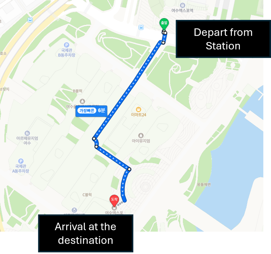 It will take around 6 minutes to get to the Yeosu Expo Convention by walk. (Approx. 400m distance)