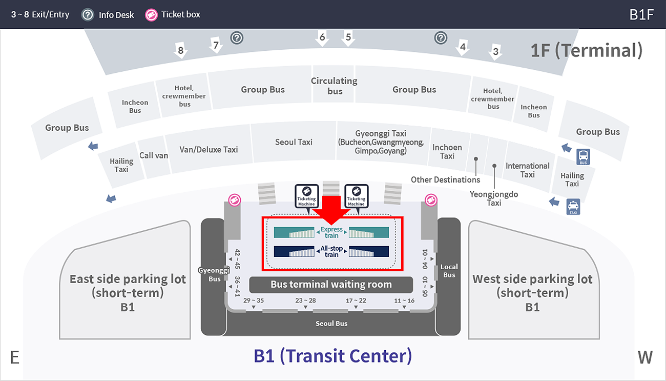 Passengers could take AREX train at the Basement Floor(B1F) of both terminals 1 & 2, respectively.